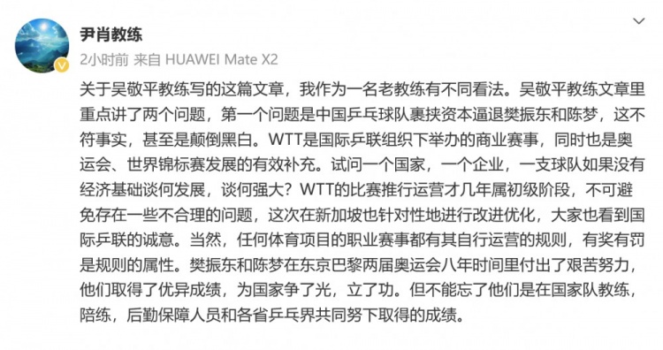 越闹越大!前国乒教练尹肖发文驳斥吴敬平,王皓、马琳点赞
