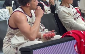 这就吃上了!洛夫顿在场边吃? 看到镜头都不好意思了?